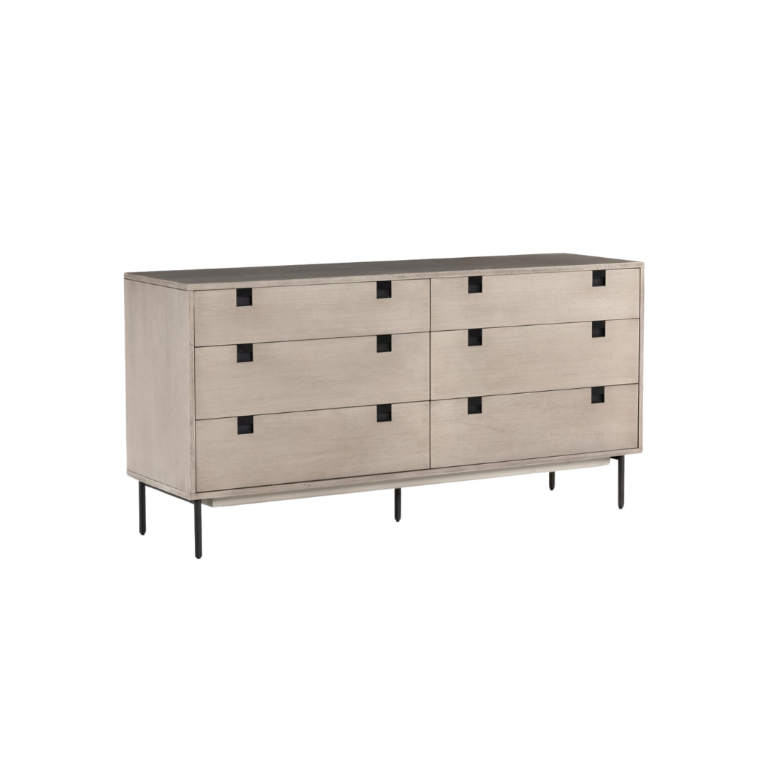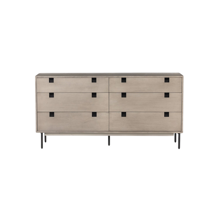 The Reeve Dresser offers a structured-yet-light look to bedroom storage, with six spacious drawers made of grey-washed acacia veneer. Its clean, streamlined design is topped with iron legs finished in antique bronze for a modern touch. Organize with ease and style.