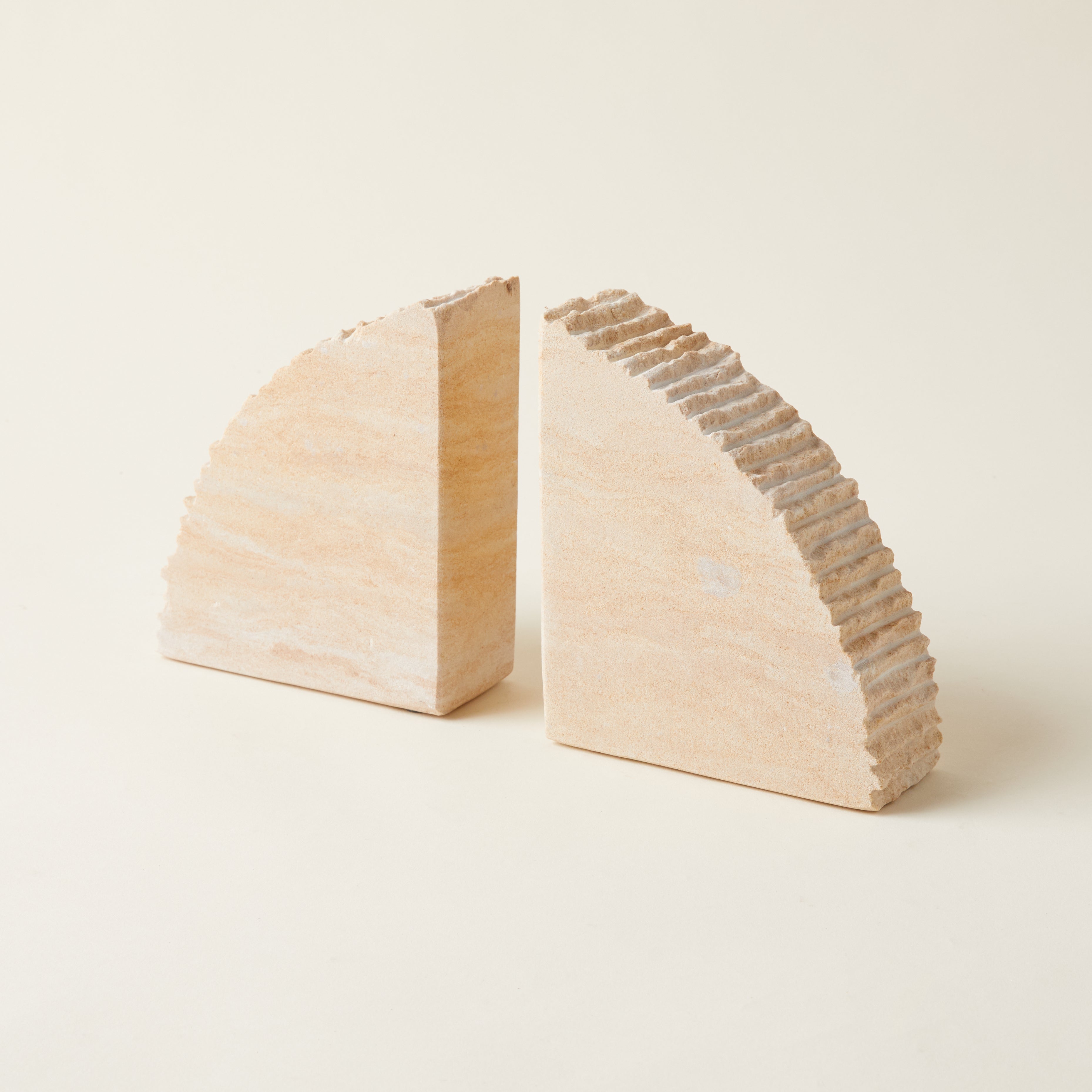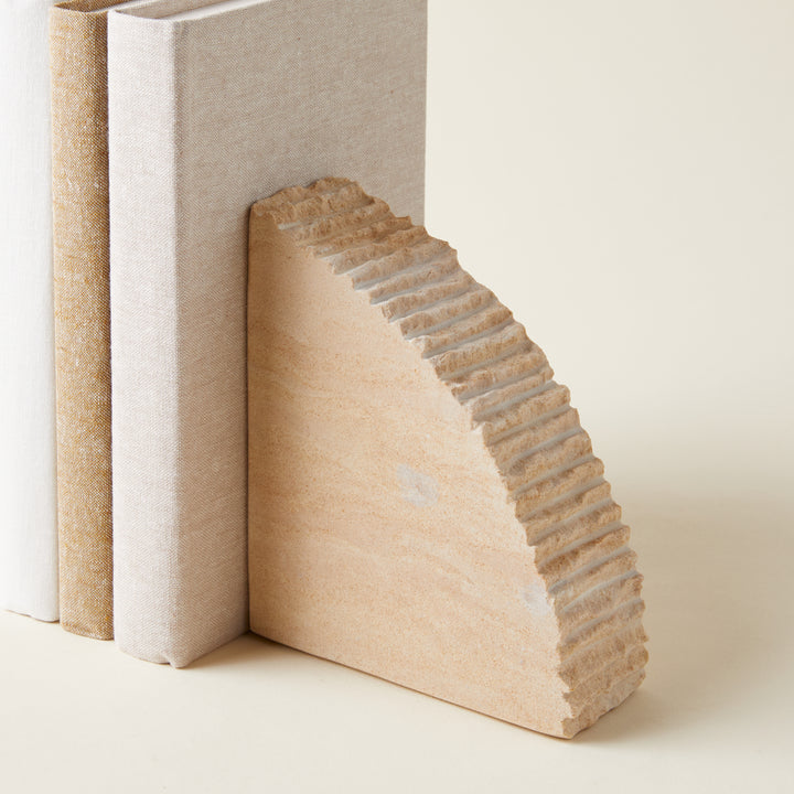 Add warmth and texture to any space with these sturdy Ribbed Sandstone Bookends. Made of natural sandstone with a smooth, matte finish, these bookends feature a textured ribbed edge design for a refined look. Perfect for organizing and displaying books, magazines, or used as a decorative object, this set of two brings visual interest to any space.