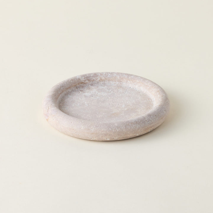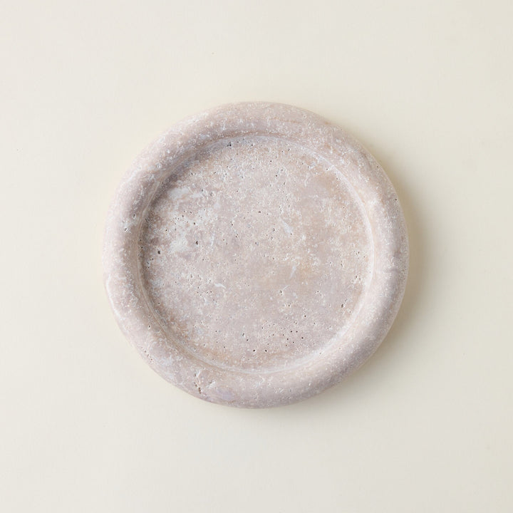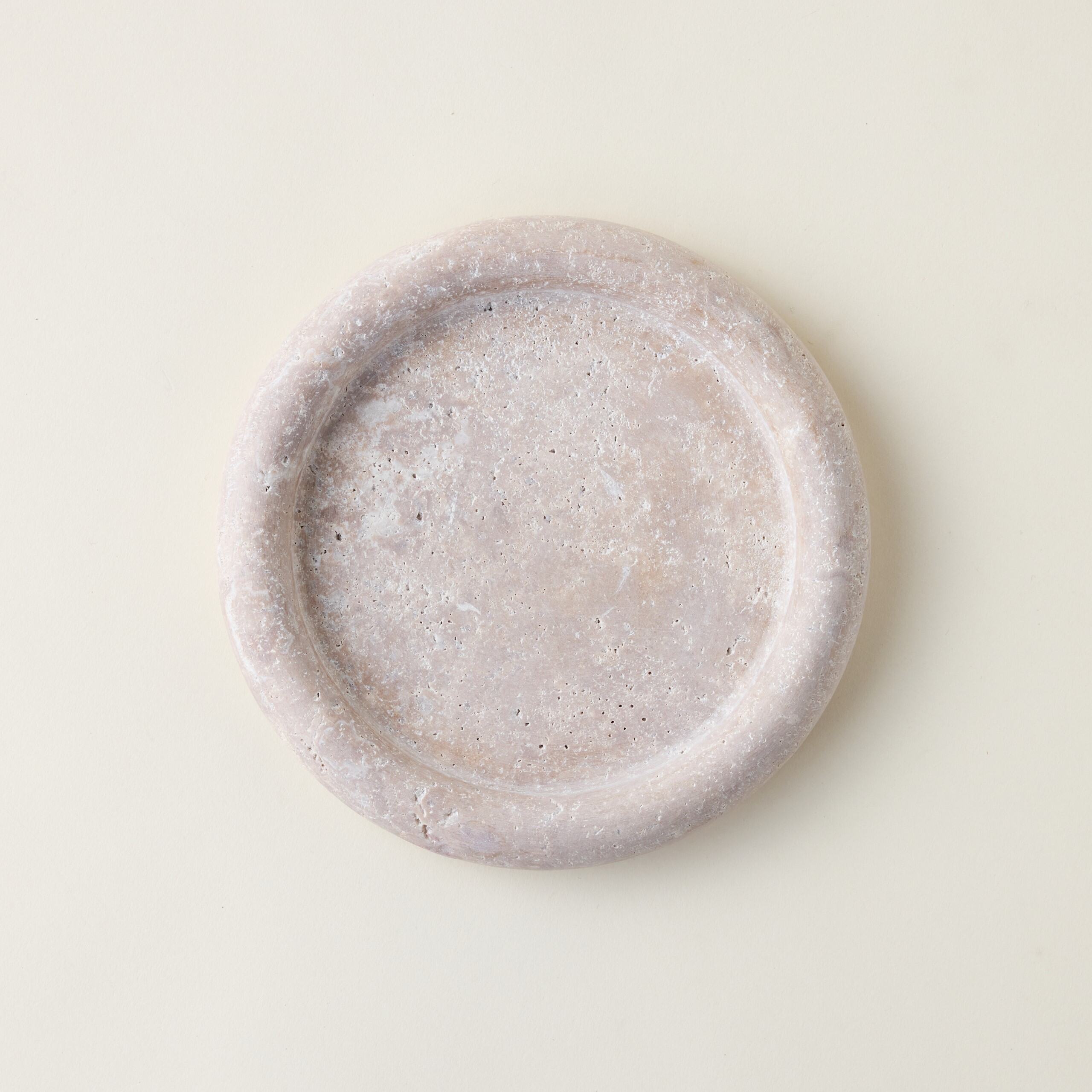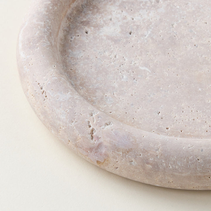 Crafted from durable travertine stone, this sleek and versatile round tray is the perfect addition to any vanity or night stand. With its smooth surface and ample size, it's ideal for storing all of your beauty essentials or jewelry in one convenient location. Keep your space organized and stylish with this must-have tray.