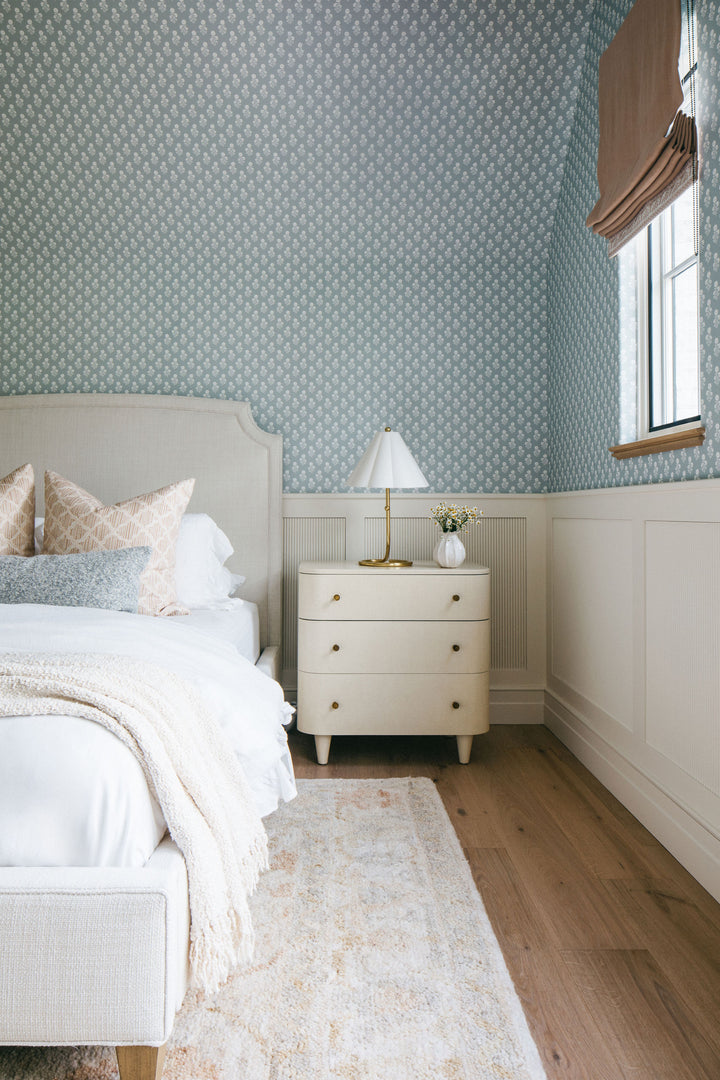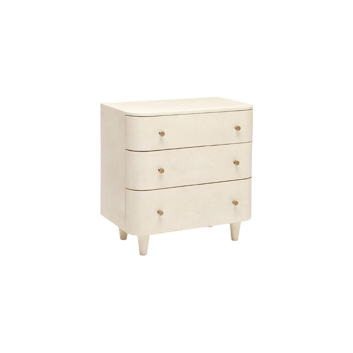 The Ruby Nightstand features an Art Deco-inspired silhouette that embodies classic Upper East Side elegance. Crafted from off-white faux raffia, it showcases rounded corners and tapered legs, complemented by distinctive hardware. This refined design adds a sophisticated touch to any bedroom, blending timeless style with artisanal craftsmanship.
