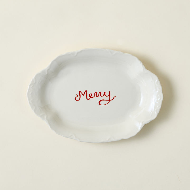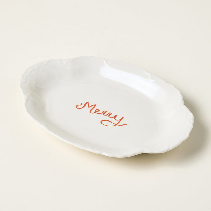 Crafted from durable stoneware, this scalloped platter features an embossed edge with the festive script "Merry" highlighted in cream and red. Its elegant design offers a sophisticated platform for serving holiday treats, appetizers, or desserts, combining functionality with seasonal charm to elevate any table setting.
