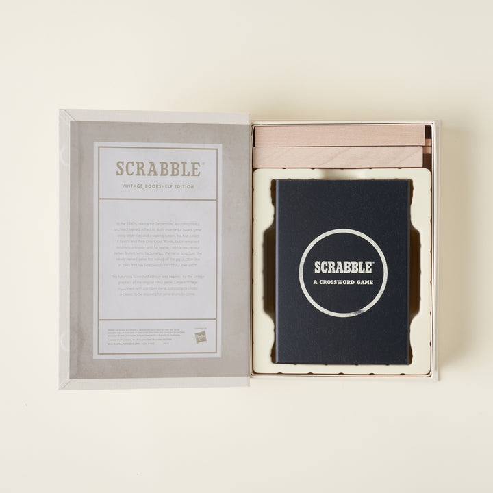 Indulge in nostalgia with the Scrabble Vintage Edition! Inspired by the original 1948 game, it features a fabric-wrapped book box for elegant storage on your bookshelf. Premium game components and a vintage game board create a classic experience to be passed down for generations. Includes wood letter tiles, tile racks, and score pad for endless wordplay fun.