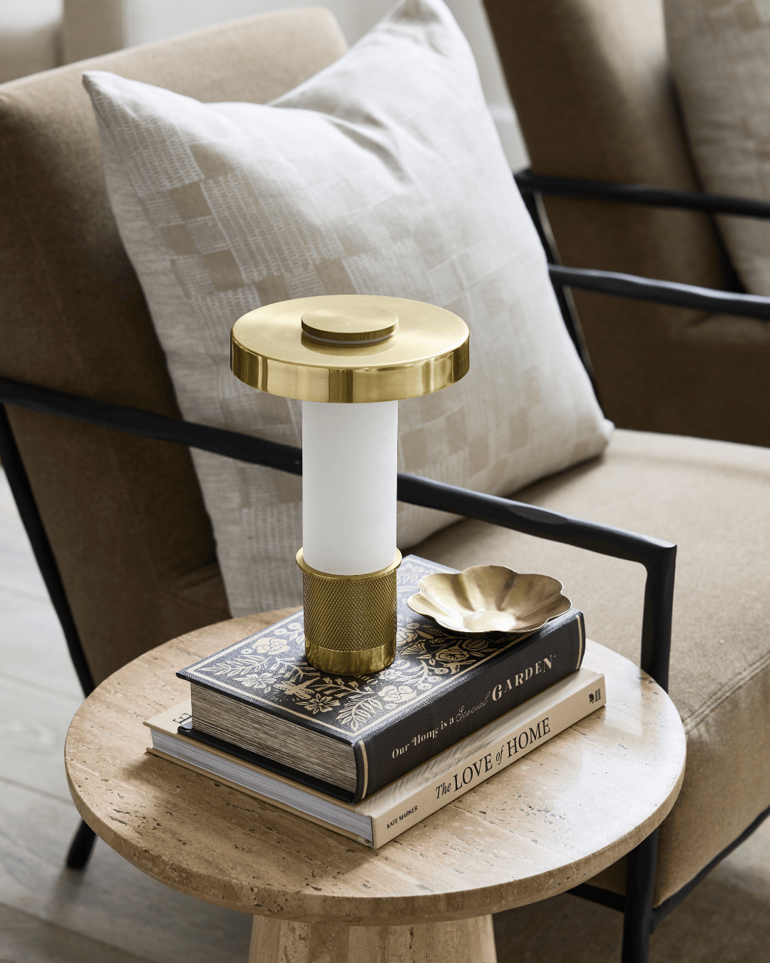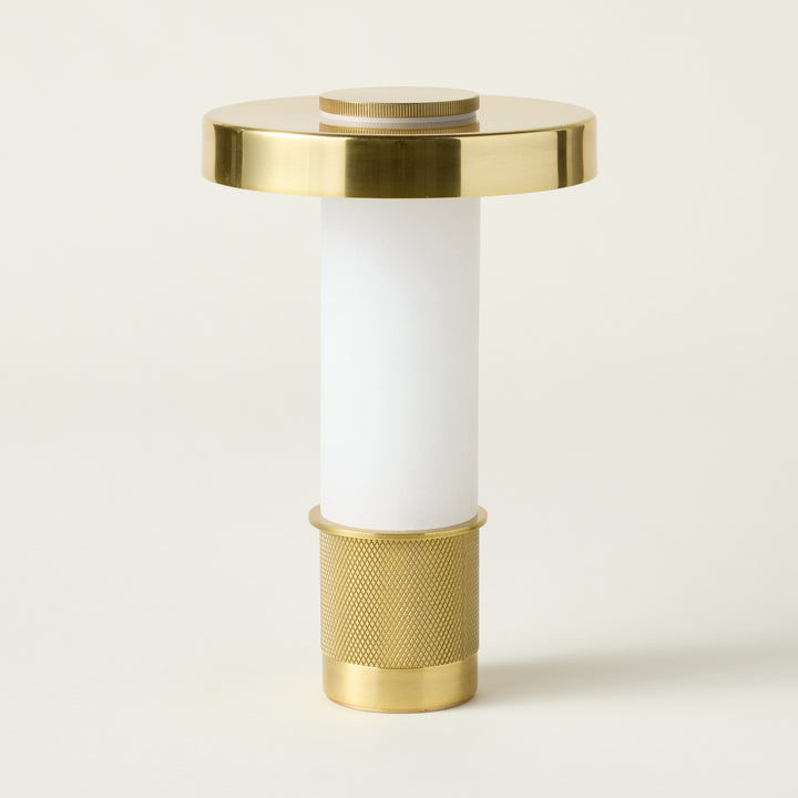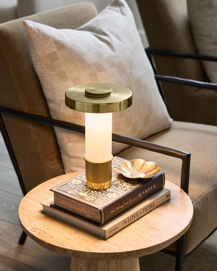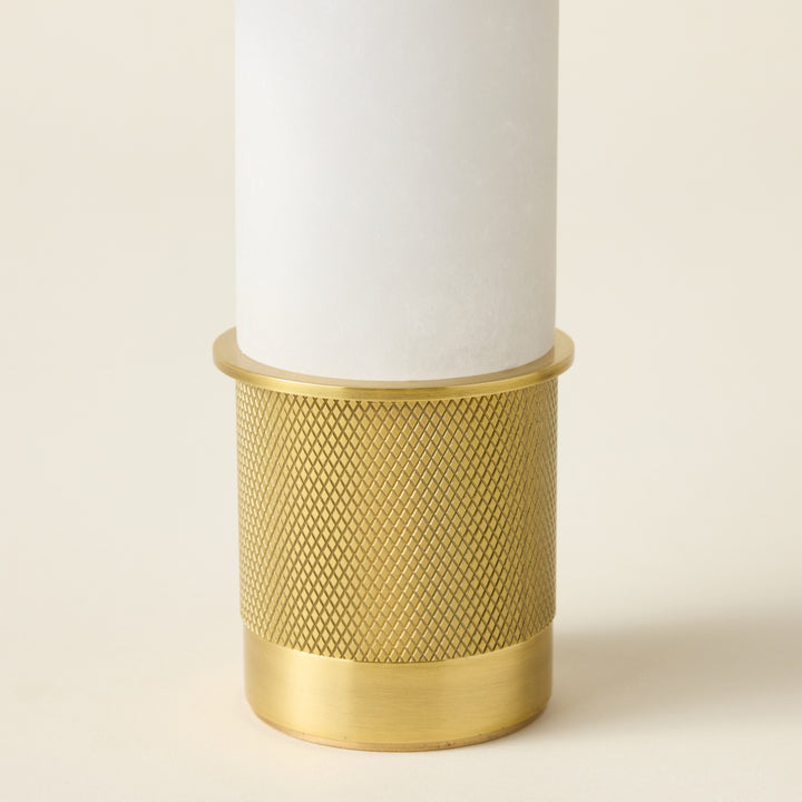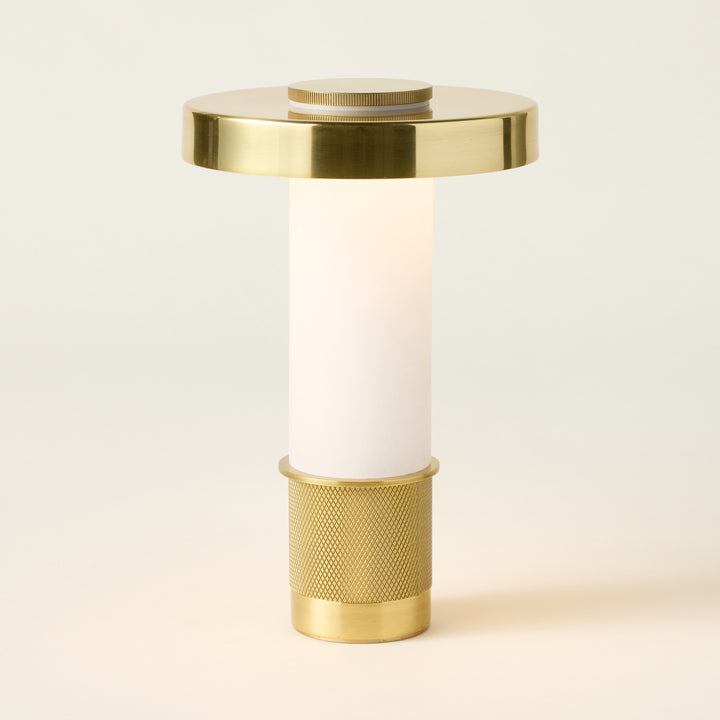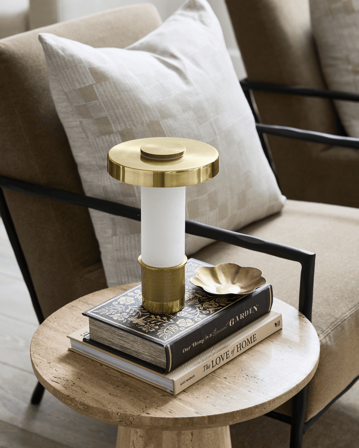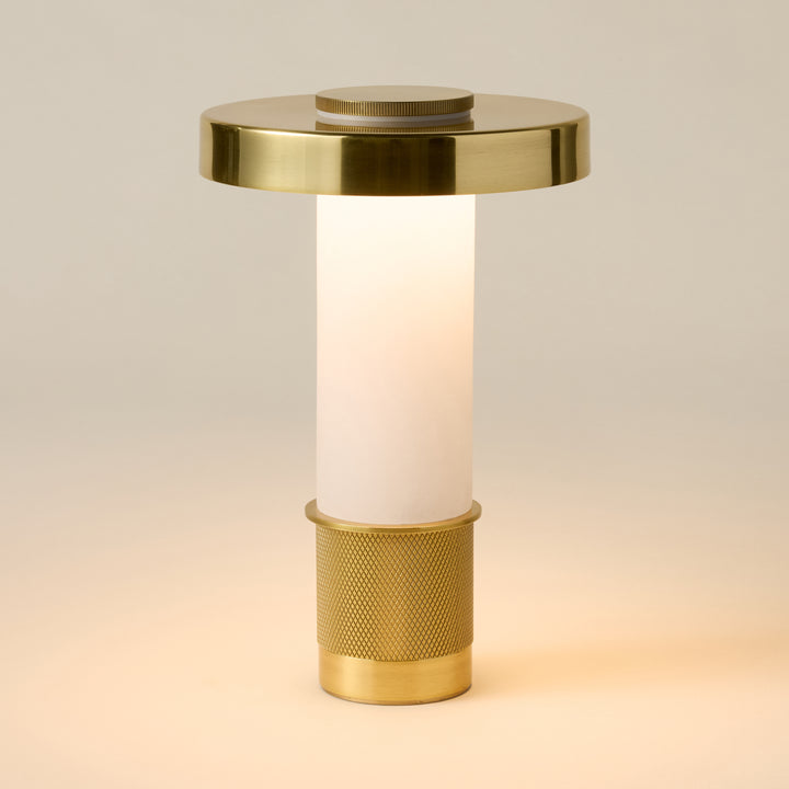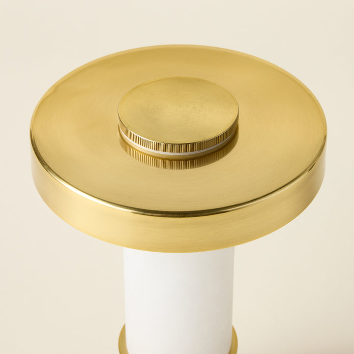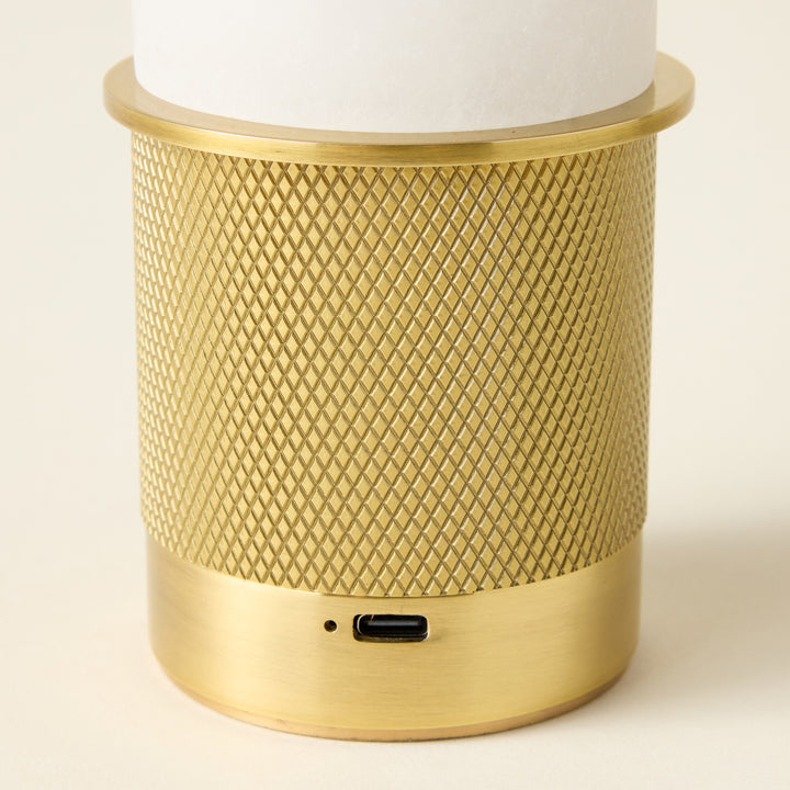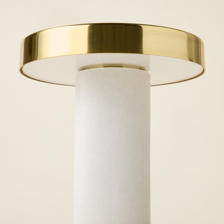 A refined blend of architectural design and functionality in a compact form. The Sefton Rechargeable Table Lamp features a sleek alabaster tube paired with a precision-machined metal base, delivering a sophisticated accent to any space. Its cylindrical shade, finished in reflective Aged Brass, enhances its elegant profile. This dimmable lamp provides adjustable lighting and a rechargeable battery that powers use for hours, with a 3.5-hour recharge time. Designed for versatility, it can be operated while charging, making it ideal for both ambient and task lighting needs.