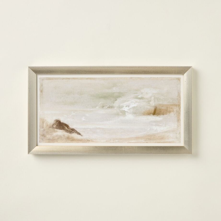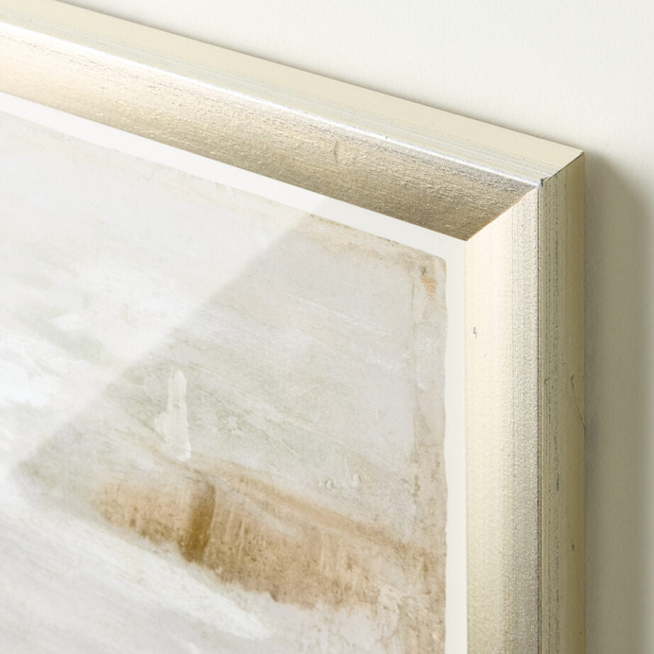 Experience the tranquil beauty of the Serenity Petite Scapes. Featuring a blend of calming hues, against crashing white waves. The warm, muted champagne frame adds a calming touch to this stunning seascape. Perfect for layering on a bookshelf or incorporating in a gallery.
