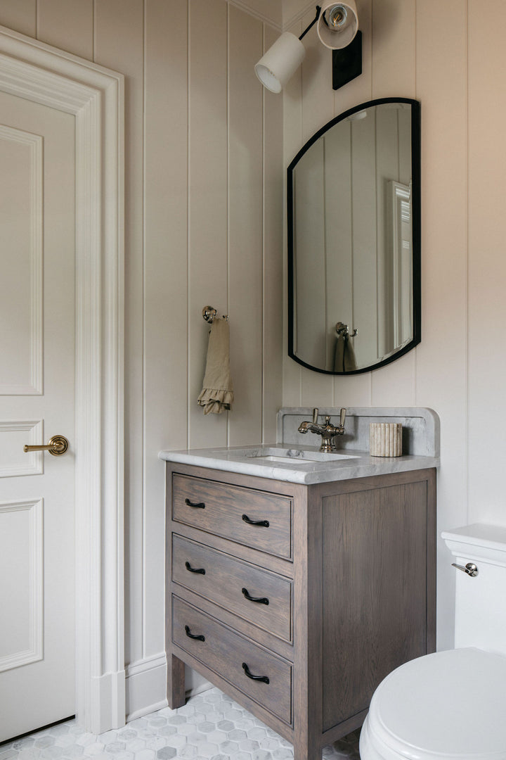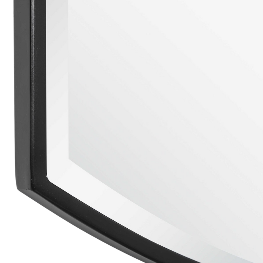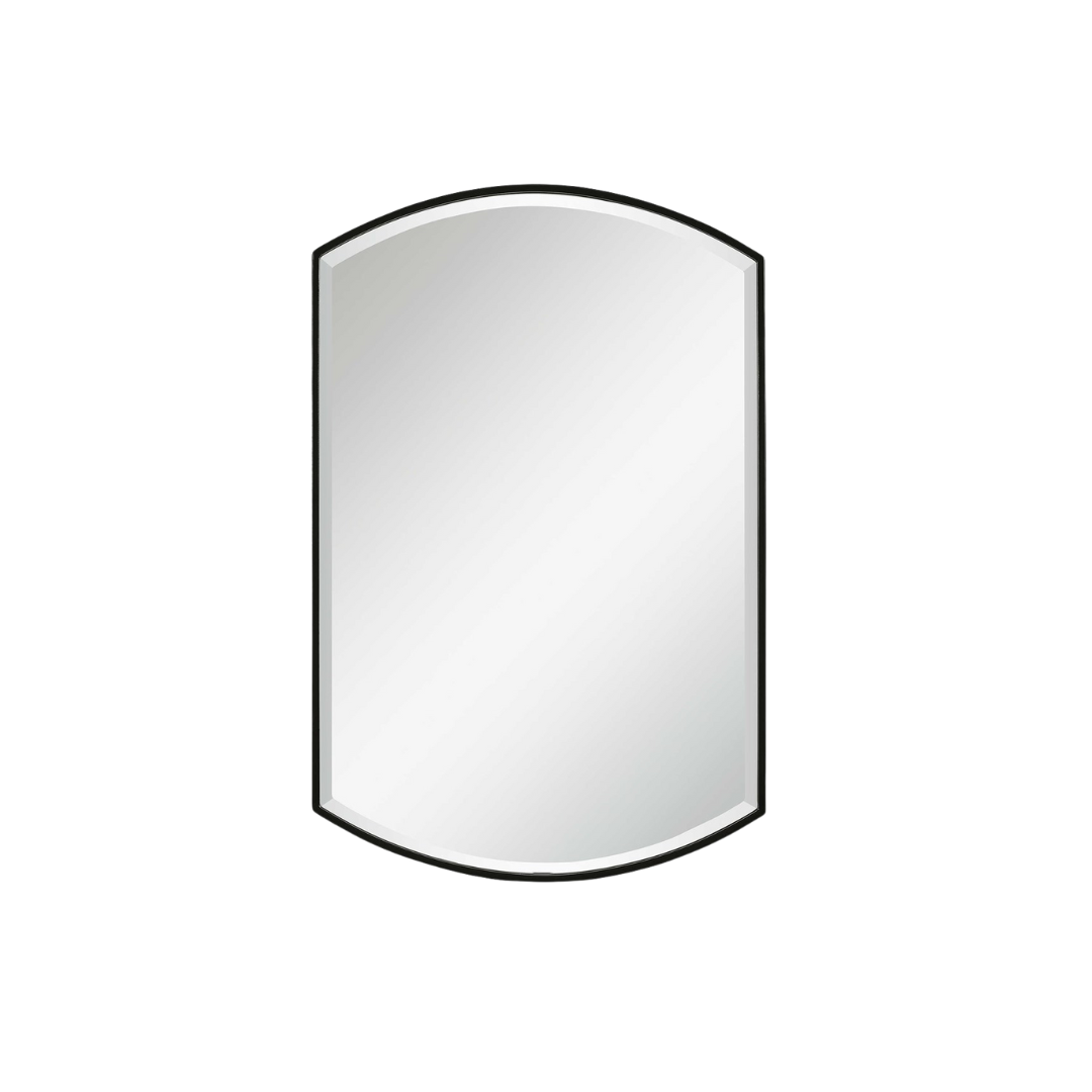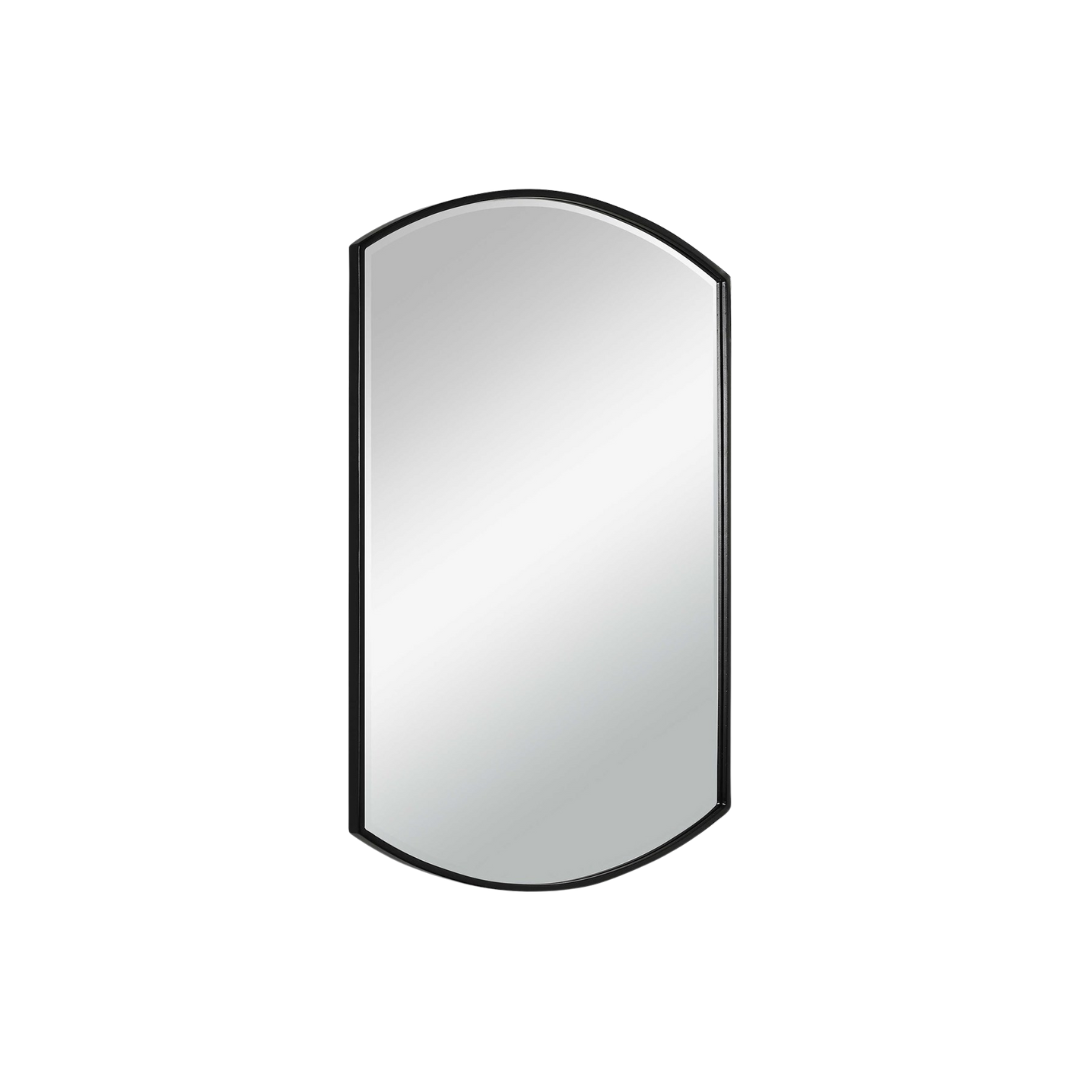 Simple yet versatile, this mirror features a curved iron frame with a sleek satin black finish and a generous 1 1/4" bevel.