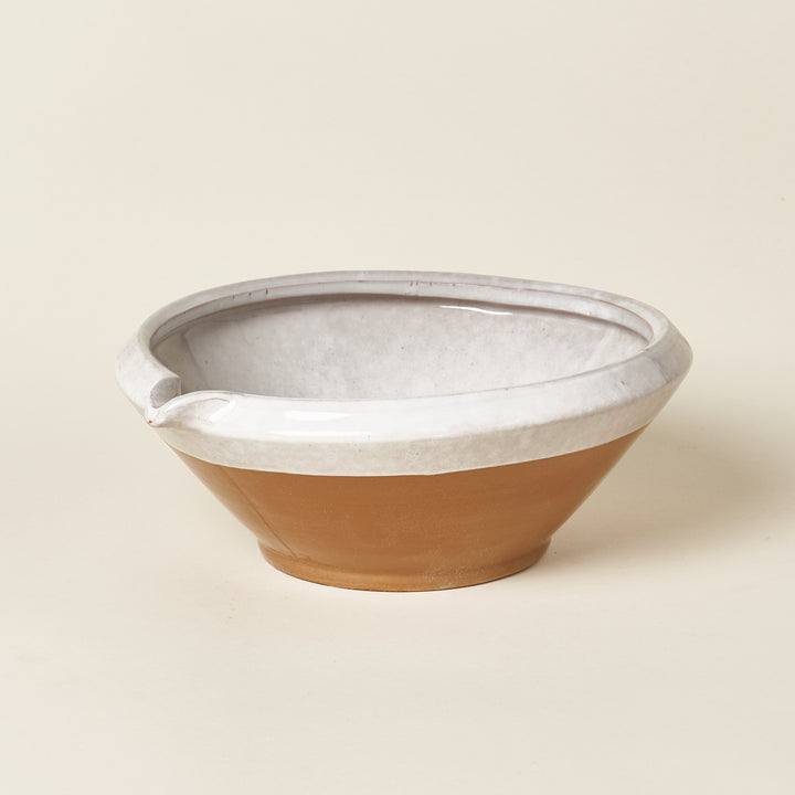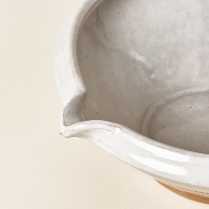 This unique bowl is a beautiful addition to any kitchen. Made out of stoneware, this batter bowl features a white reactive glaze finish on the interiors and a portion of the exterior of the bowl. Perfect for placing on kitchen counters, filling with fresh fruits or everyday items, and baking in style.