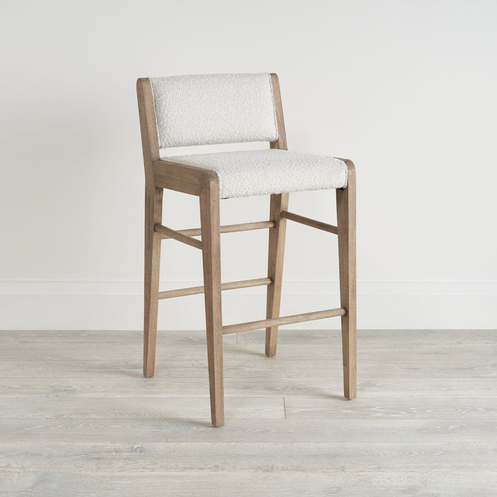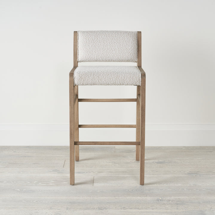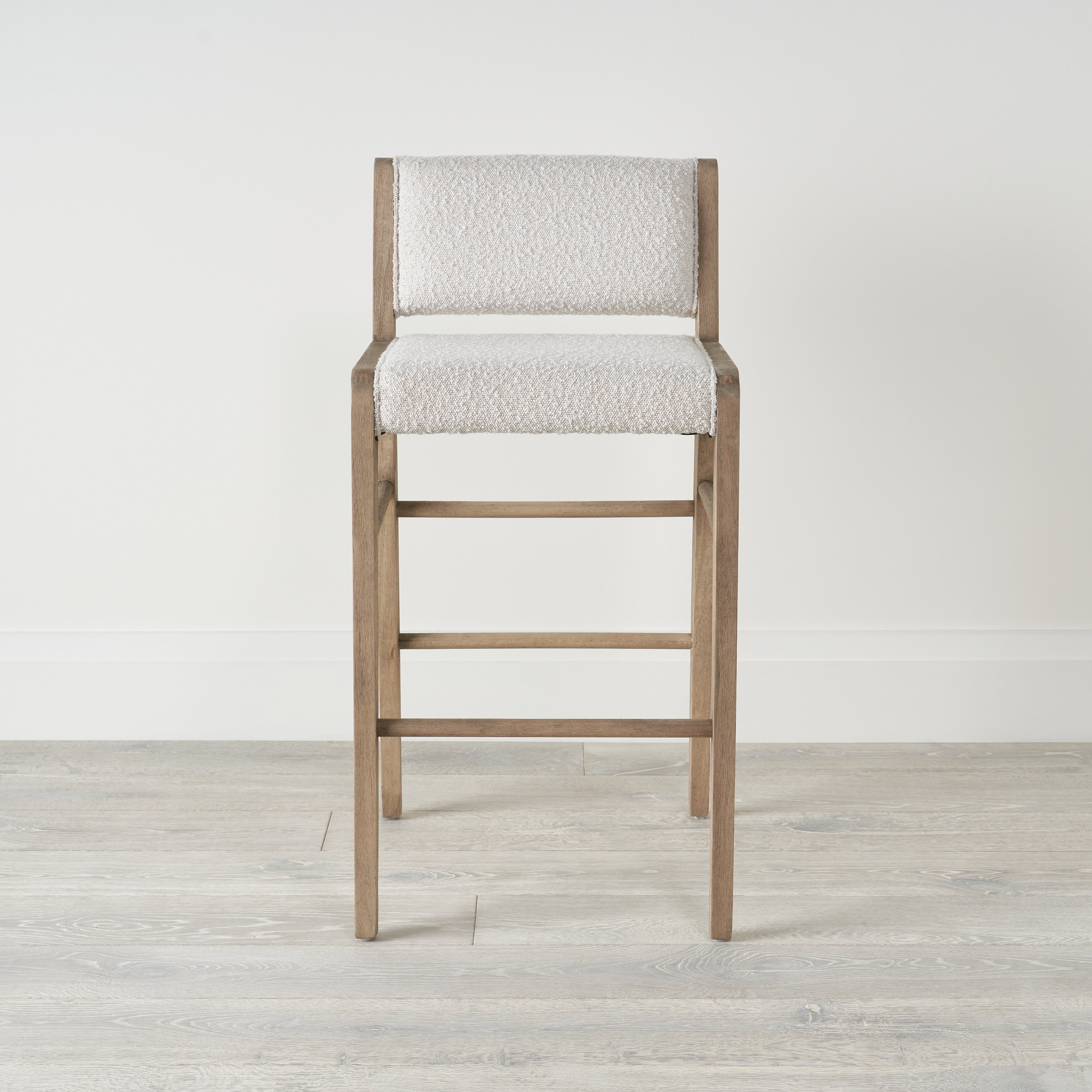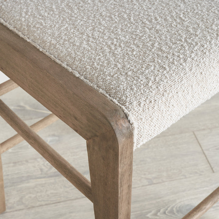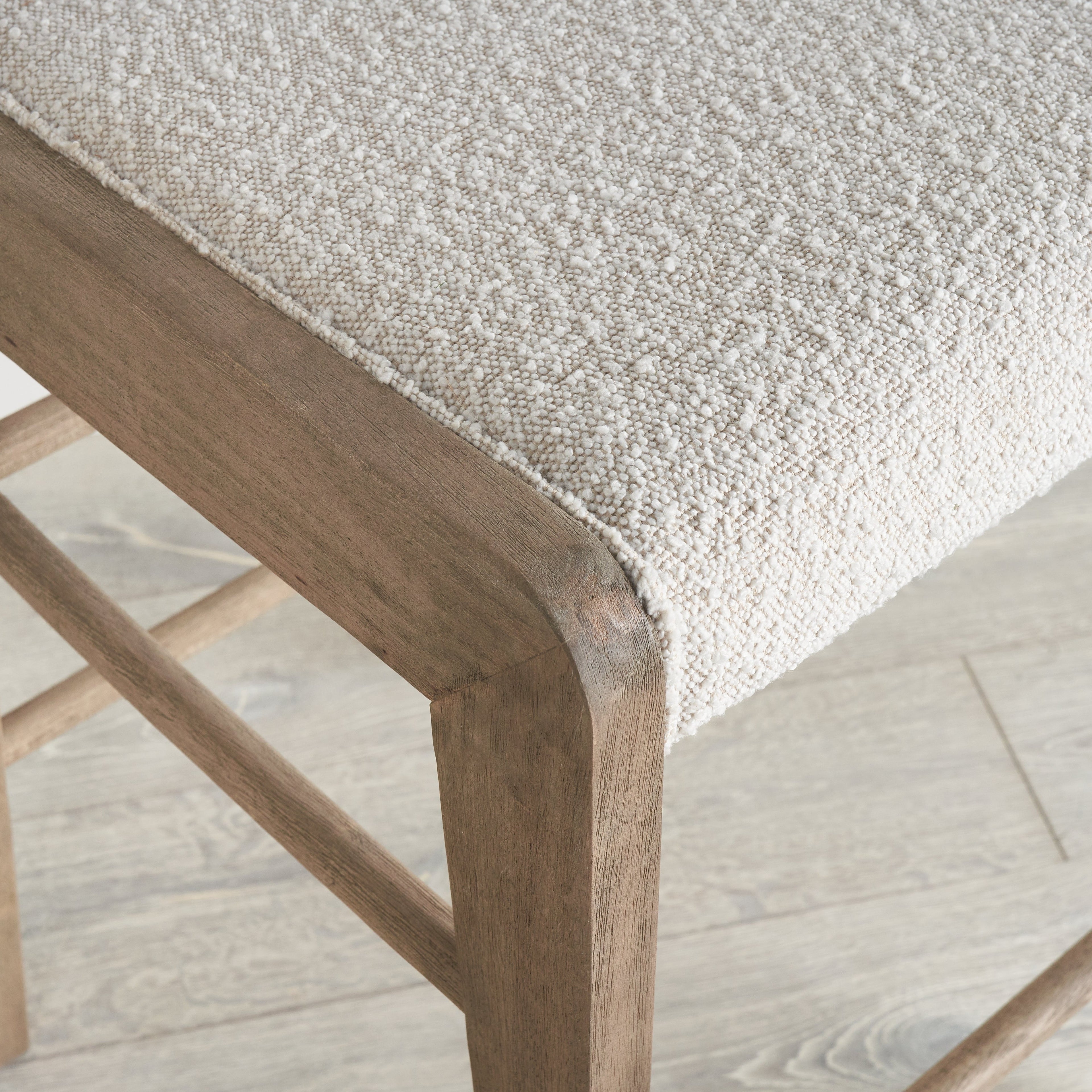 Make it modern with mixed materials. In a light, natural finish, solid parawood forms an angular frame for boucle-upholstered counter/bar seating in a classic cream. Performance fabrics are specially created to withstand spills, stains, high traffic and wear, ensuring long-term comfort and unmatched durability.