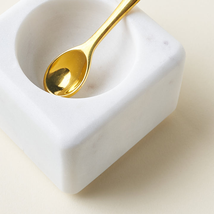 A beautiful way to elevate your table decor. This Square Marble Bowl with Spoon is a timeless addition to any kitchen. Featuring a unique square shape with a rounded opening, this practical piece is as stylish as it is functional. Use it for serving jam or sauces when entertaining, or keep it by the stove with your favorite salt. The included polished brass spoon adds a touch of artful elegance, making this a truly versatile piece.