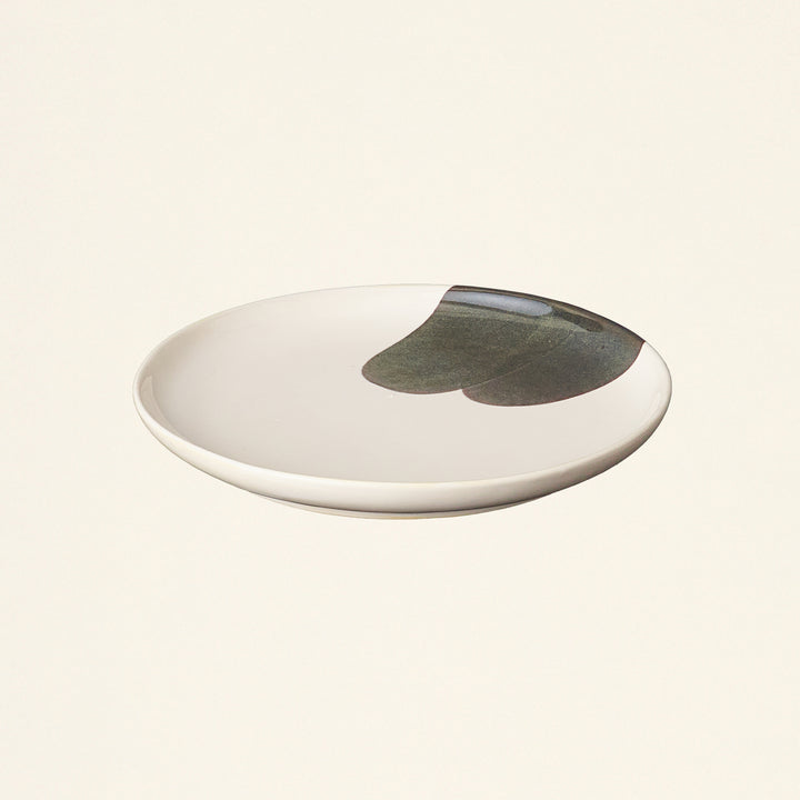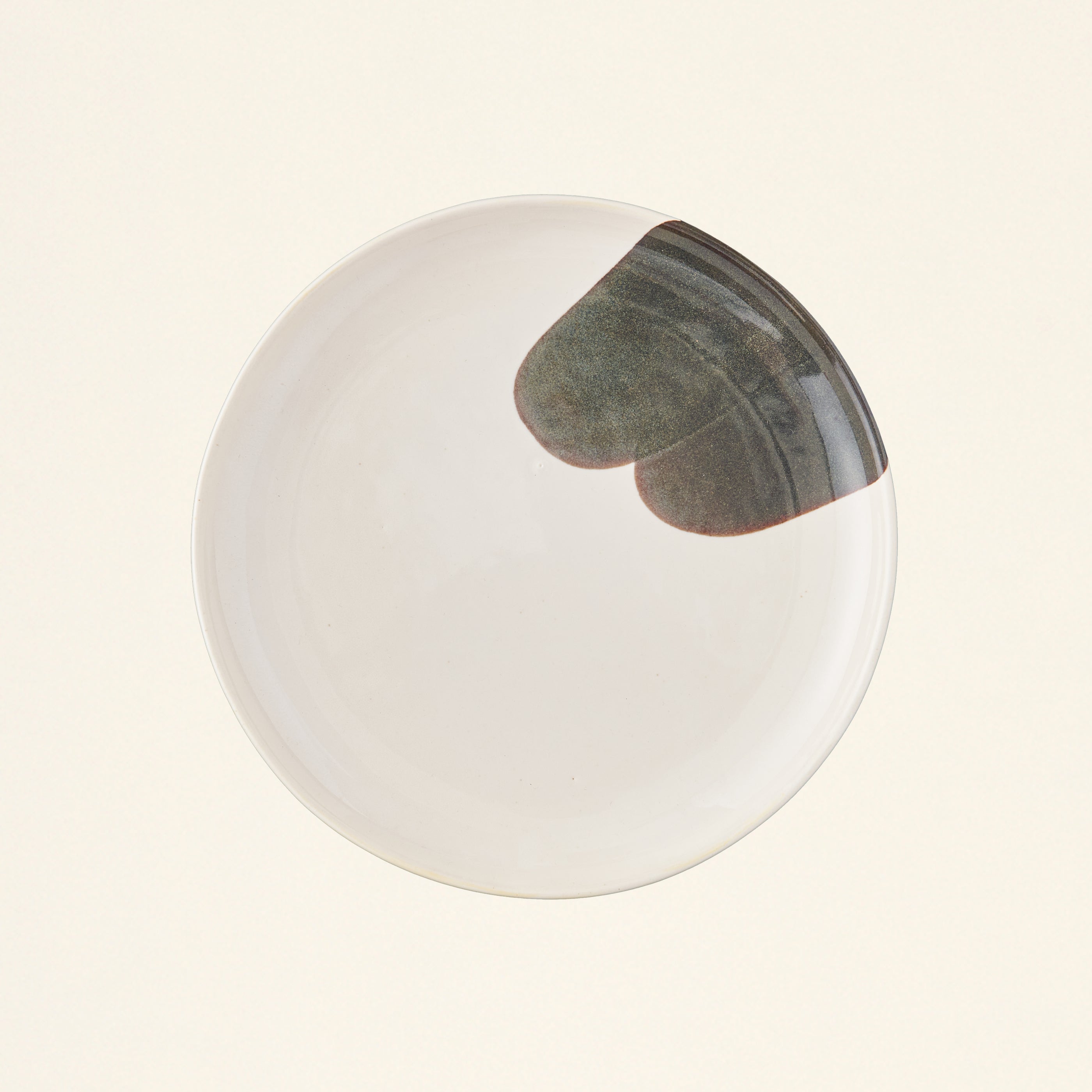 A beautiful earthy addition to your tablescape! Cream stoneware plate with reactive glaze in a deep teal. Great to layer onto dinner plates in a table setting or to use. Each plate will vary.