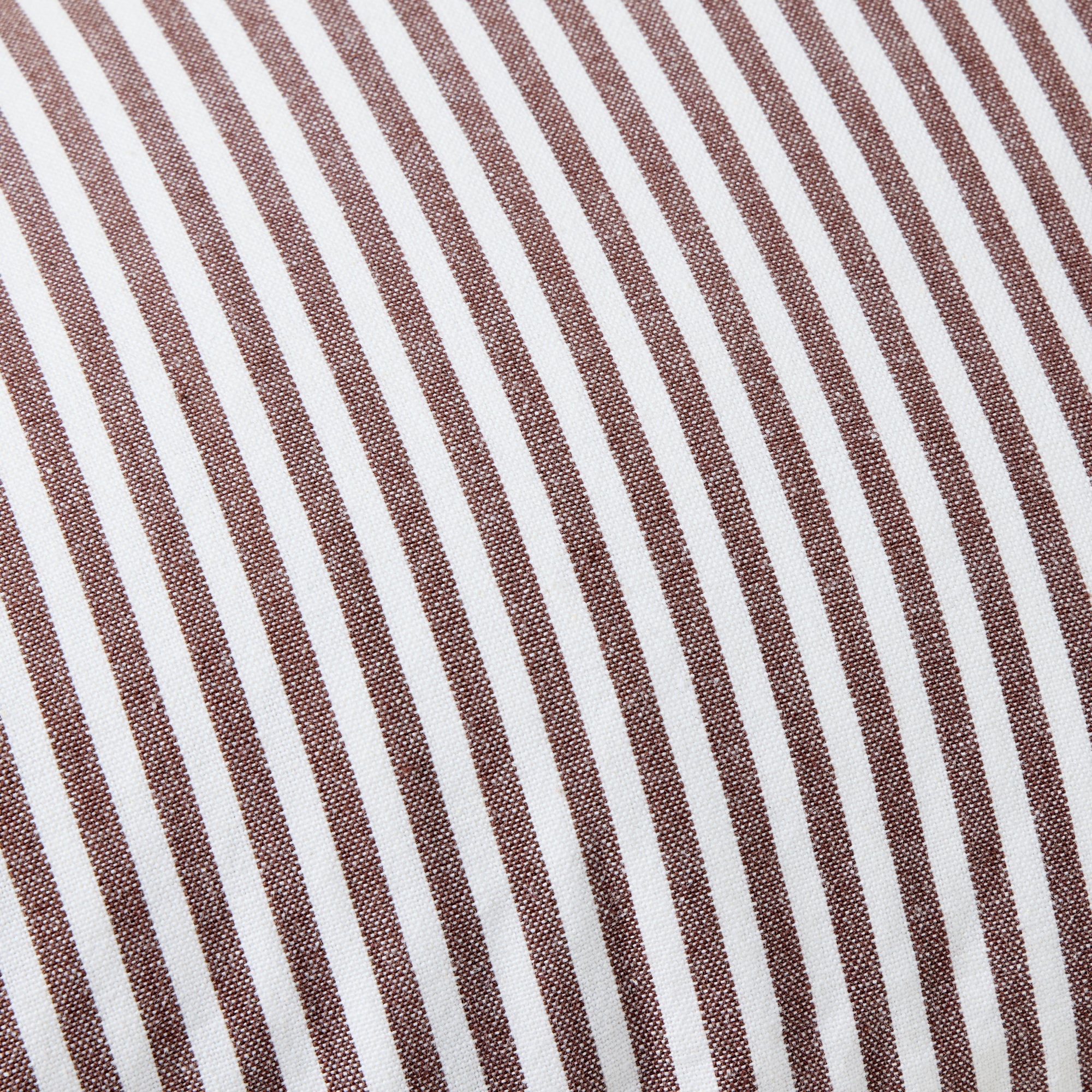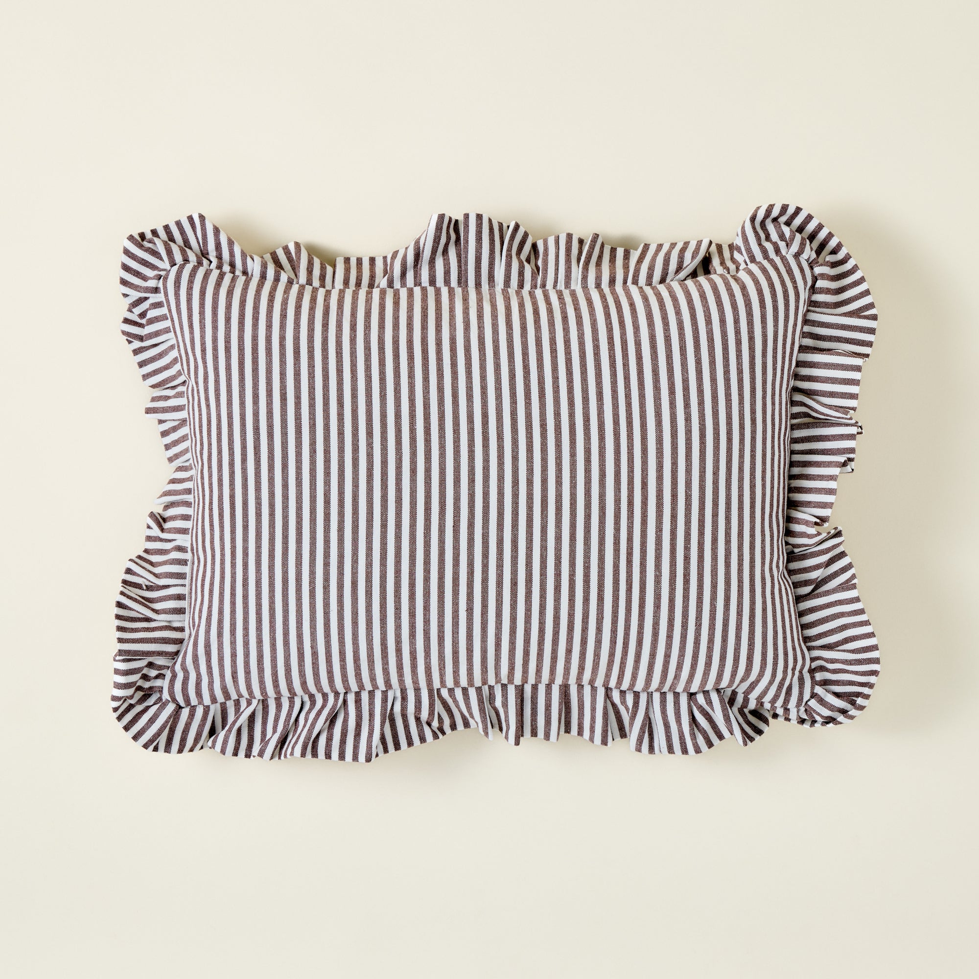 Crafted from 100% high-quality cotton, the Striped Ruffle Lumbar Pillow brings an elegant touch to any space. Its unique ruffled edge complements the stylish brown and white striped pattern, creating a sophisticated accent for your home decor. A concealed zip closure ensures a seamless look while allowing easy care. Handmade with attention to detail, this pillow combines comfort and refined design to elevate your living area with lasting charm.
