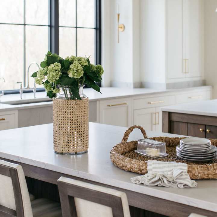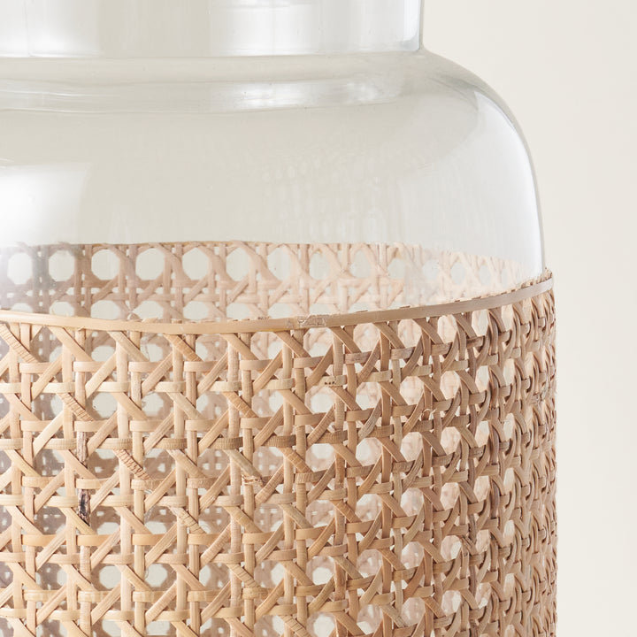 Bring a sense of serene style to your space with this Woven Cane Vase, a beautiful combination of natural and artful materials. Its clear glass form is embraced by a beautifully hand-woven cane cover, adding a rich, authentic texture.