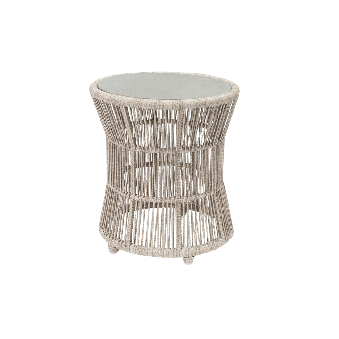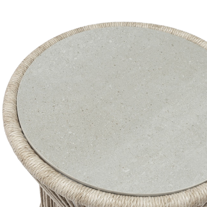 The Teagan Outdoor Side Table is crafted with a powder coated aluminum frame and hand-woven all-weather synthetic abaca, providing durability against cracking, peeling, fading, breaking, and stretching. It features an inset ceramic top and is perfect for outdoor use.