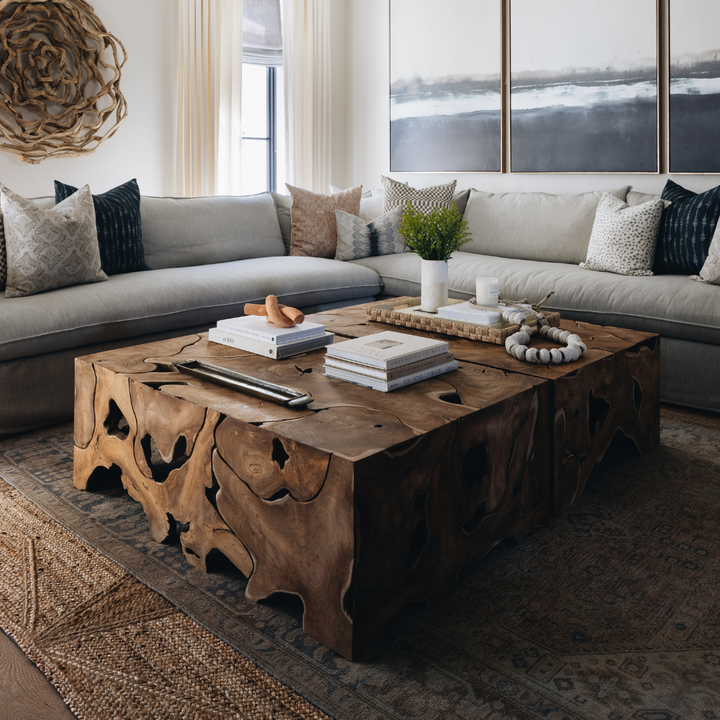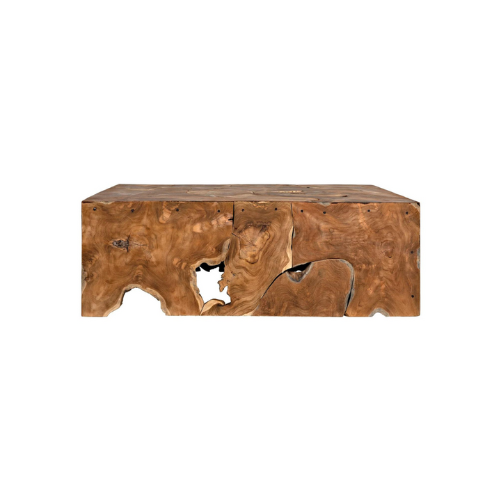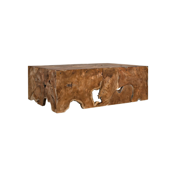 Unique teak coffee table that brings warmth and dimension to a living space. Every table is one of a kind.