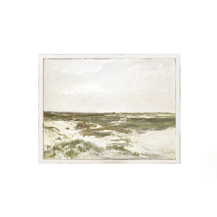 Experience the tranquil beauty of Camiers with The Dunes Petite Scapes. A picturesque image of pale dunes and lush greenery, captured on a petite canvas and framed in distressed white. Perfect for adding a touch of nature to your space.