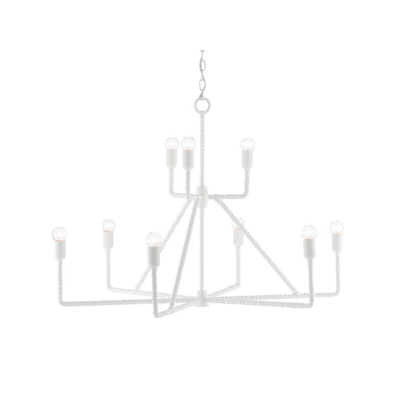 The Tristen Chandelier features a wrought iron frame meticulously wrapped in rattan with a refined gesso white finish. Its angular lines create a striking balance between simplicity and intricate design, offering a modern aesthetic that enhances any contemporary space with subtle elegance and structural interest.