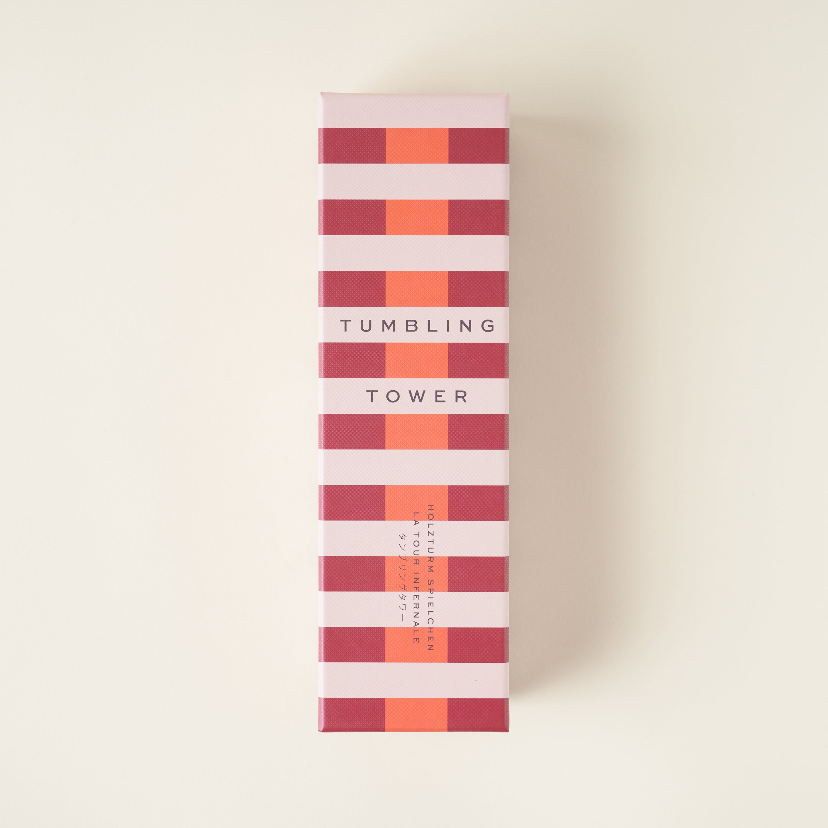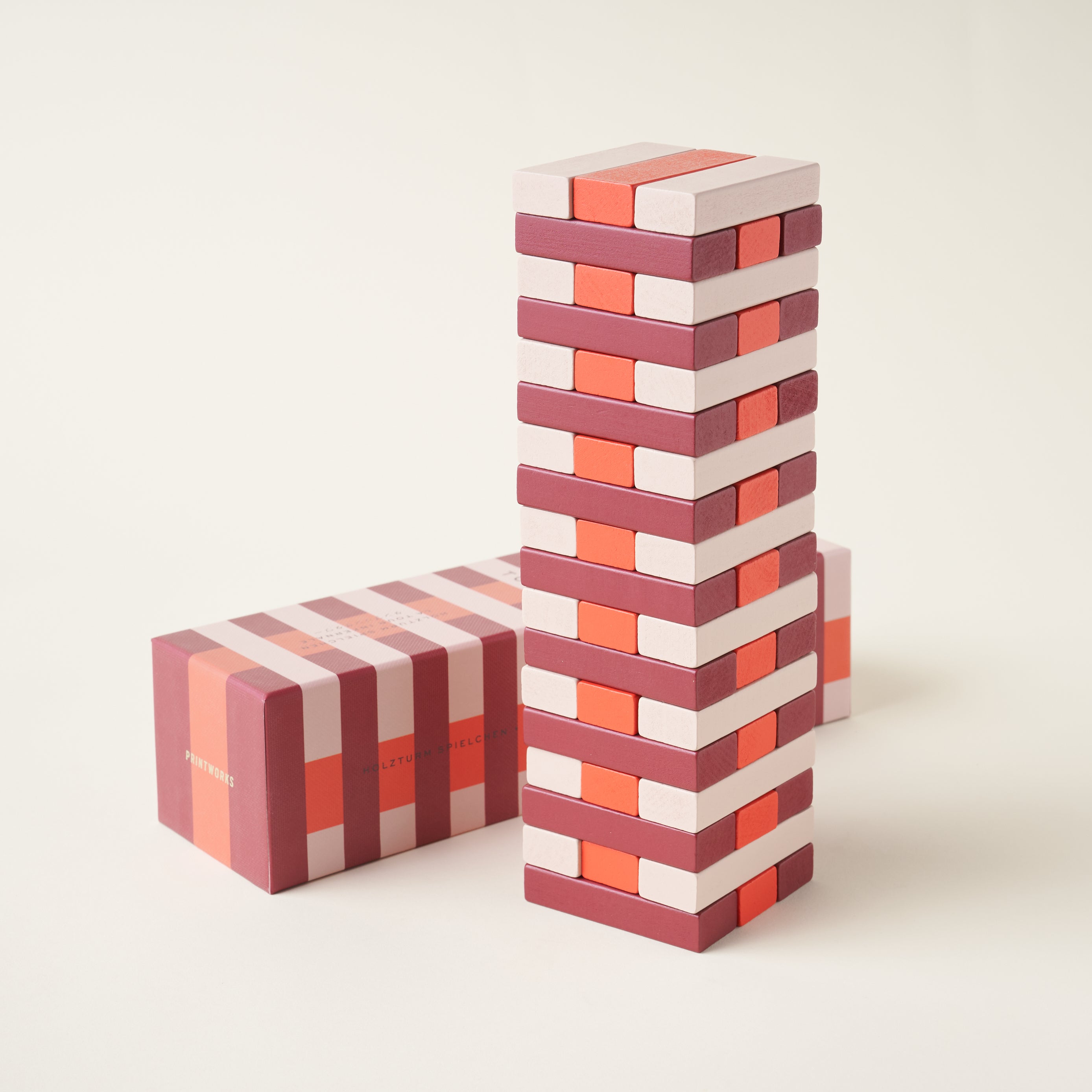 Discover a new level of family fun with Tumbling Towers. Build and rebuild the tower while avoiding any tumbles to claim victory. This elegant game comes with 54 wooden blocks in coral, burgundy, and beige, and includes instructions in English, French, and German. Perfect for 2 players and ages 4+.