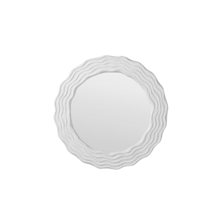 Hand-carved ripples in cast stone define the Violet Mirror’s distinctive design, combining artistry with durability. Its broad white frame offers a serene, elegant presence that enhances both indoor and outdoor spaces. This mirror not only reflects your surroundings but also adds a sculptural element to any space.