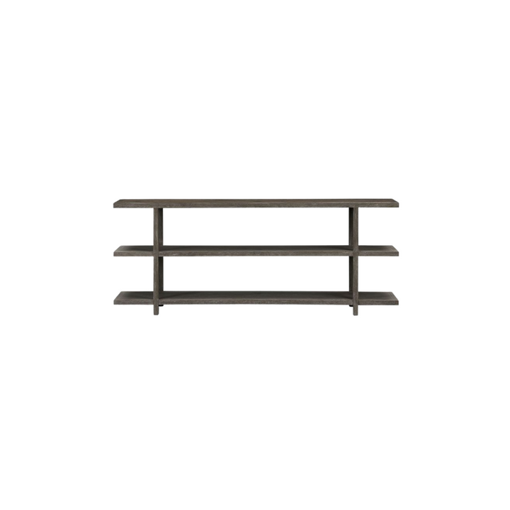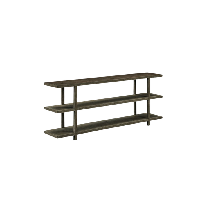 The Vivian Console showcases refined craftsmanship inspired by 16th-century Ming dynasty design. Its rectangular framed top is supported by four squared posts, creating a balanced and elegant silhouette. Two cantilevered shelves extend from each end, offering practical storage while maintaining a clean, minimalist aesthetic.