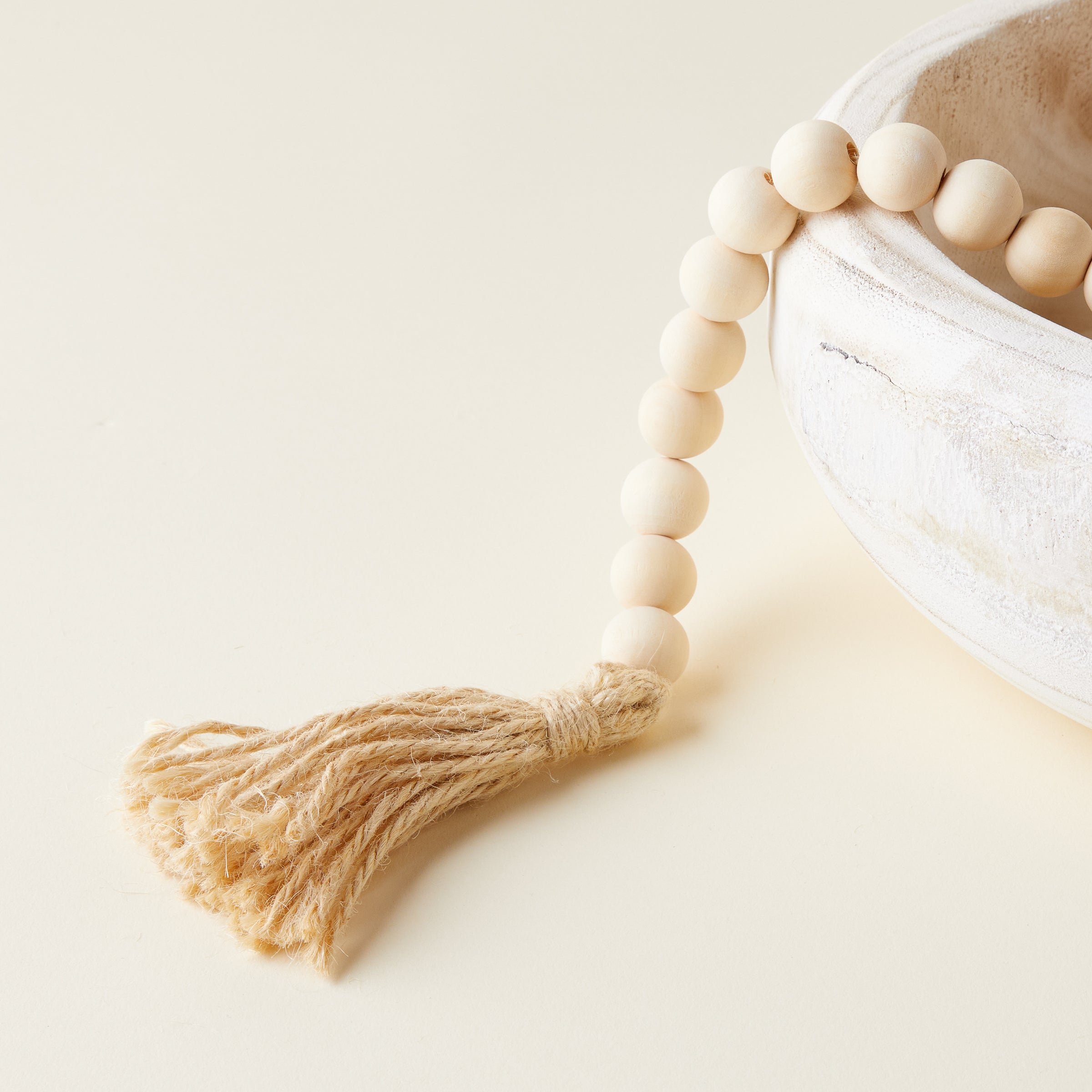 A beautiful way to add timeless charm to your home. Made from natural wood, this White Bead Garland with Tassel can be used to accent coffee tables, bookshelves, or mantels. Its versatile style can transform any space with added texture and a touch of effortless elegance.