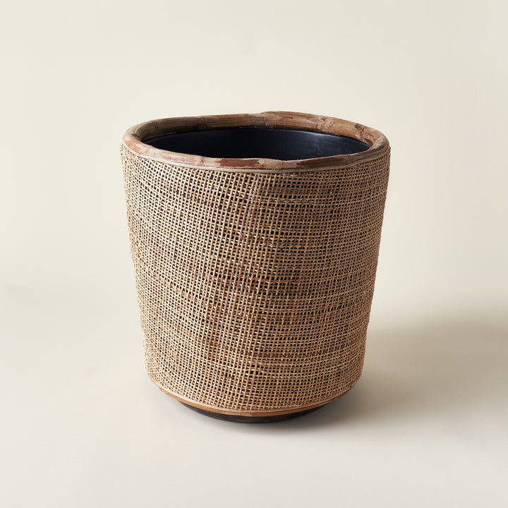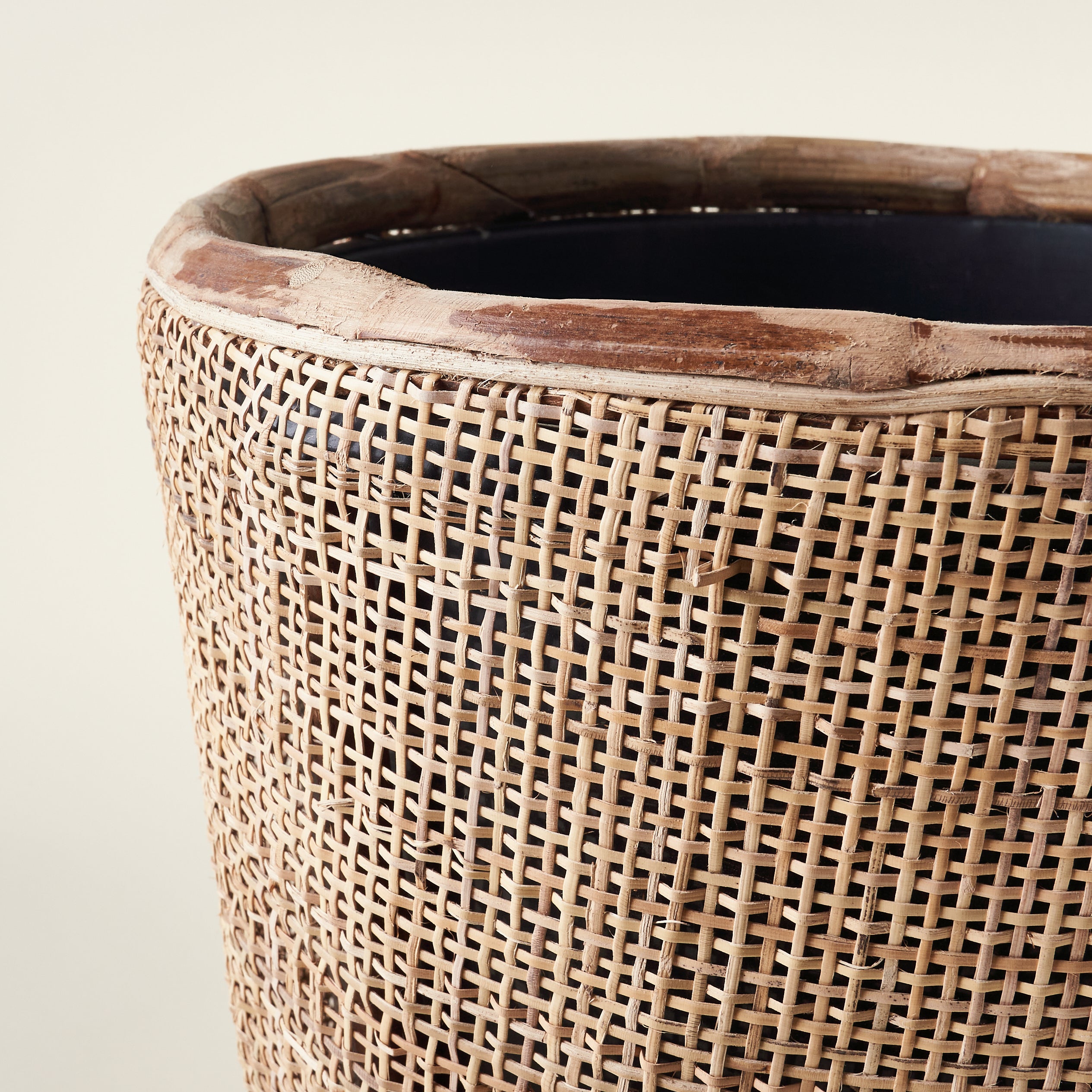 Wrapped in woven natural fiber, this pot is perfect for larger potted plants. Includes a built-in plastic liner.
