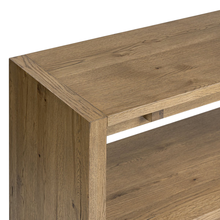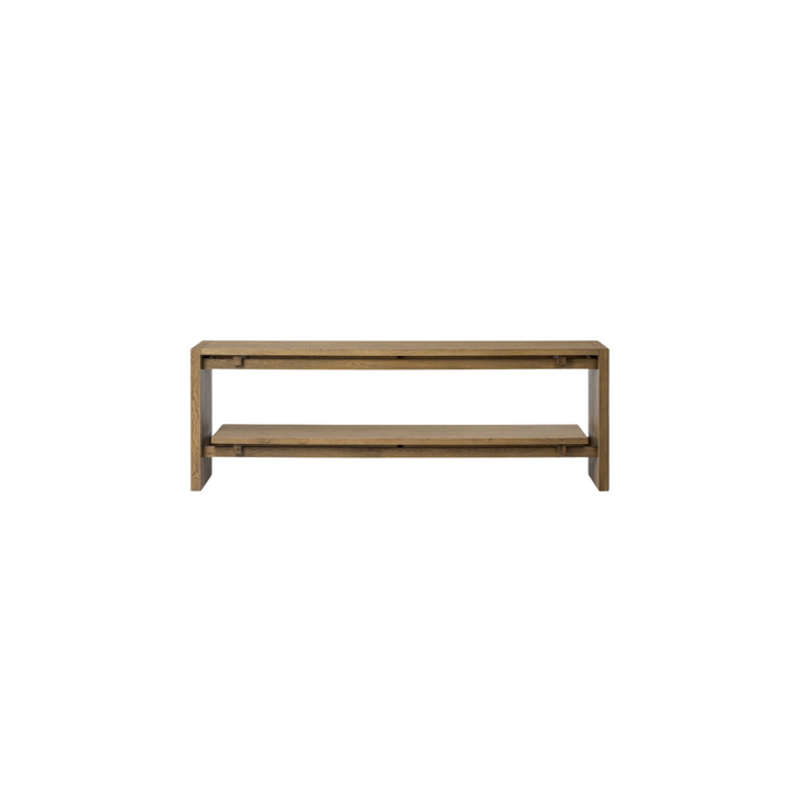 Crafted from rustic amber oak, the York Media Console features wide, float-style shelves that offer ample storage and display options for any space. Its layered cross supports provide a distinctive architectural detail, combining functionality with refined design to elevate your room’s aesthetic.
