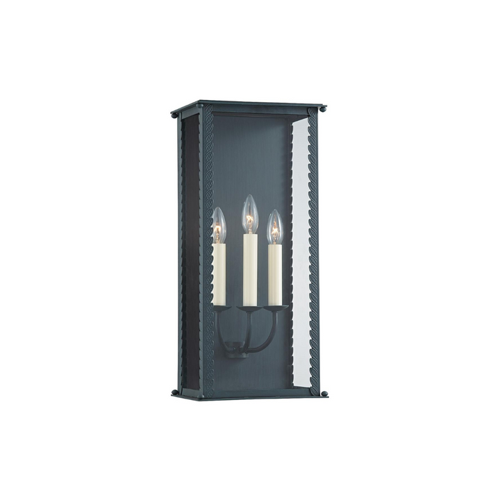 The outdoor Zuma Wall Sconce takes inspiration from nature, featuring a delicate leaf design that borders its edges. The candelabra style cage features clear glass, allowing for an unobstructed view of the candlestick lights, making for a striking addition to any exterior.